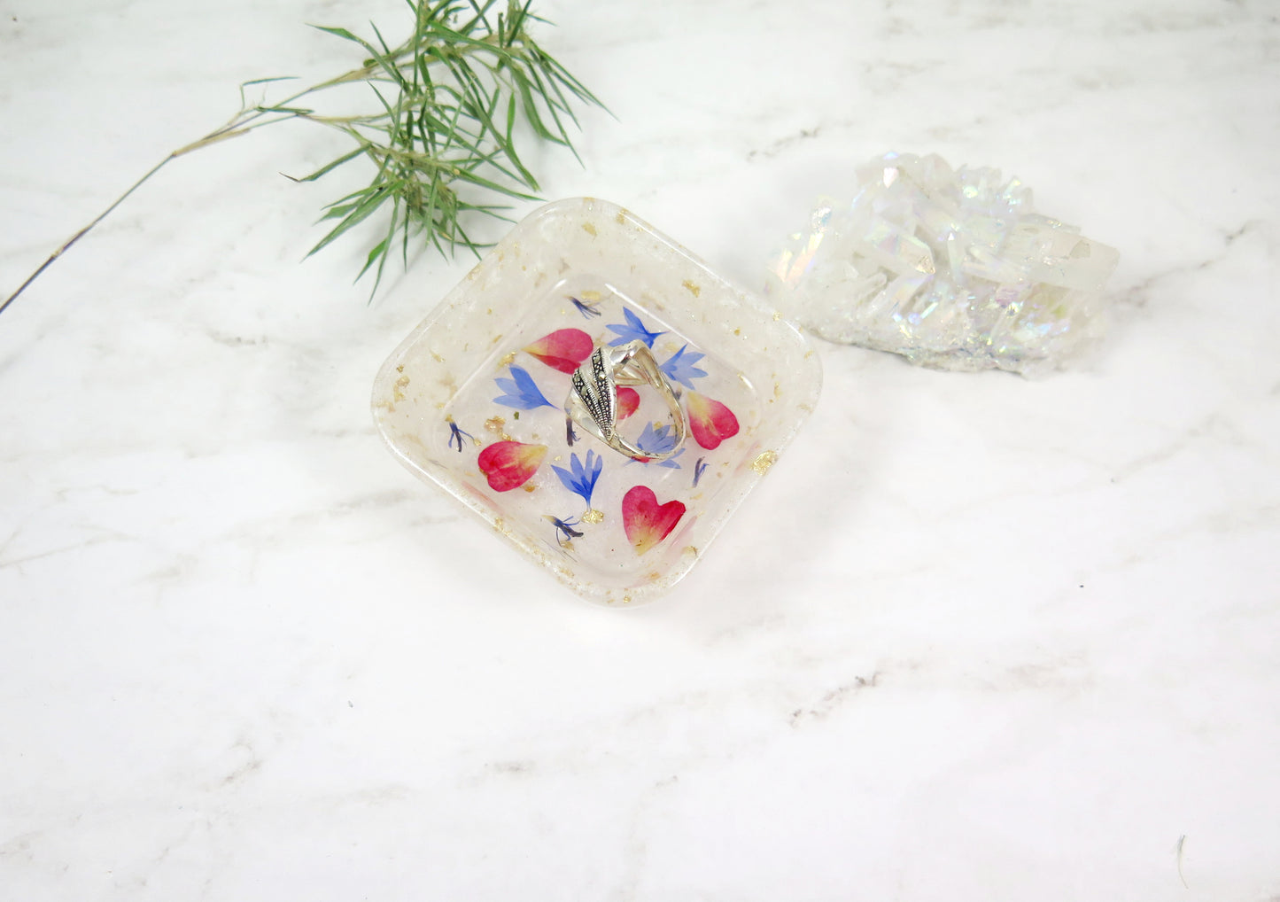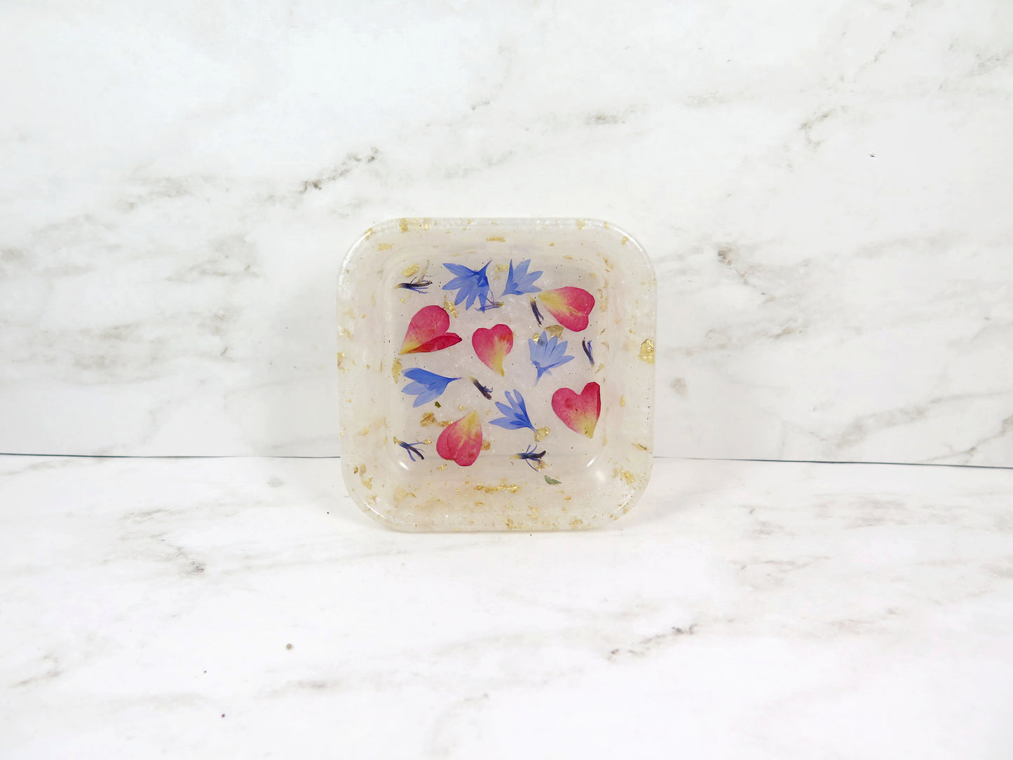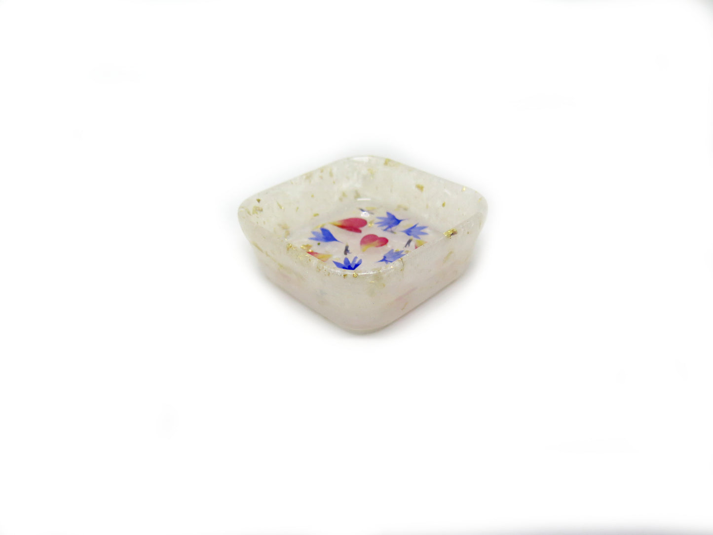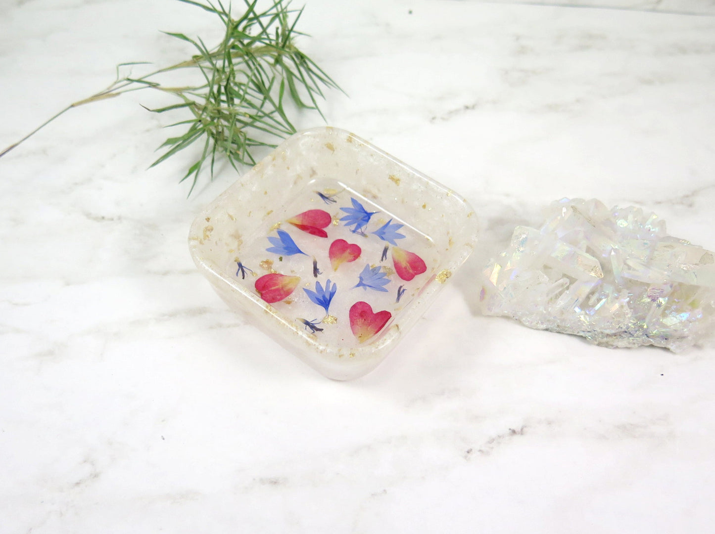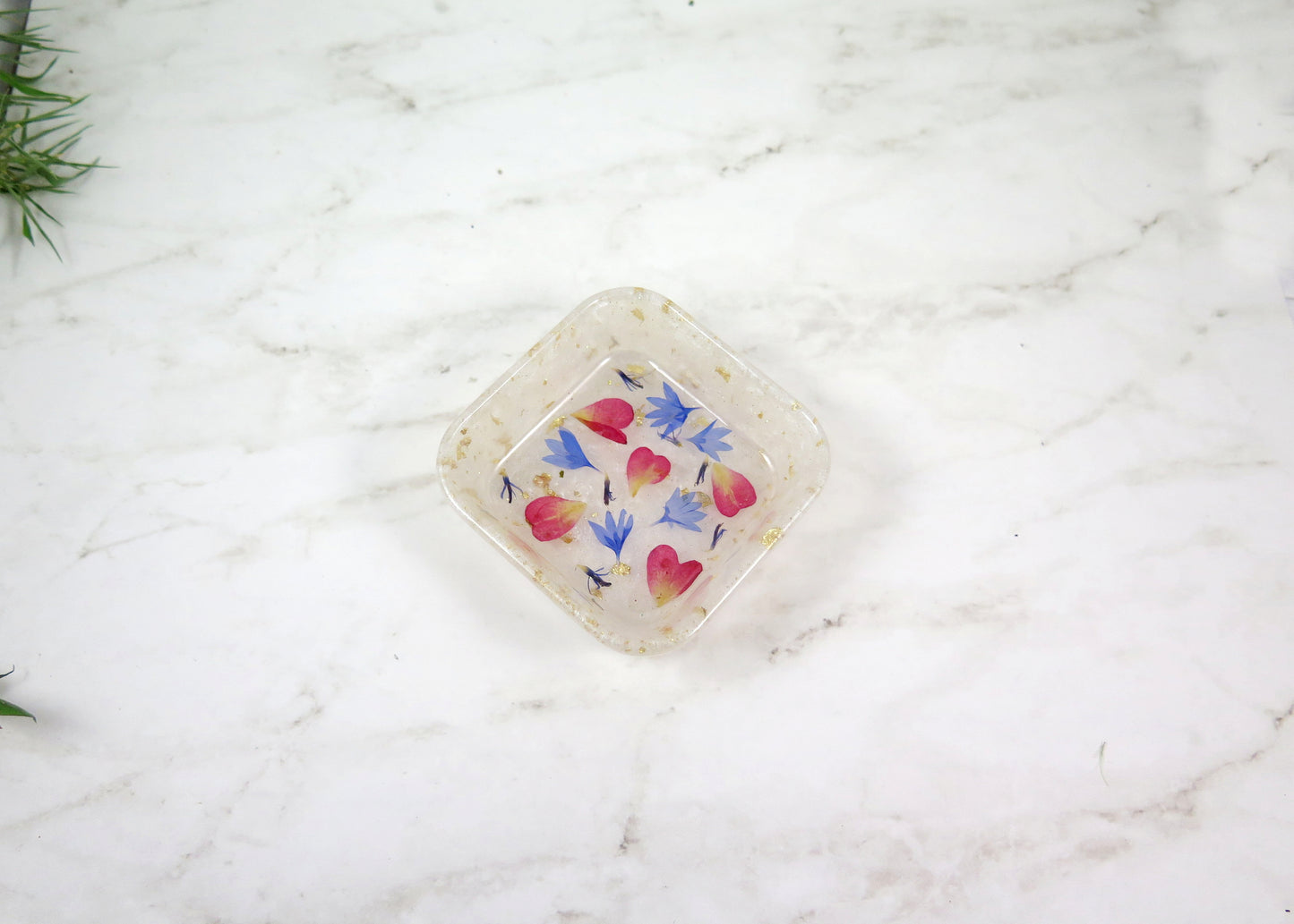 - This little floral dish is made with a real flowers (Cornflower petals and rose petals) embedded into crystal clear resin. Handpicked, Dried and Embedded into crystal clear resin this beautiful dish is perfect for any nature lover. . It is made of high-quality clear resin and soft-touch finishes. Carefully sanded and polished by hand.