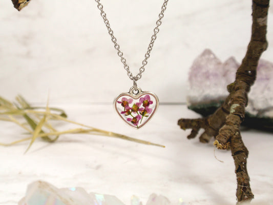 Dainty heart shape necklace with pressed flowers