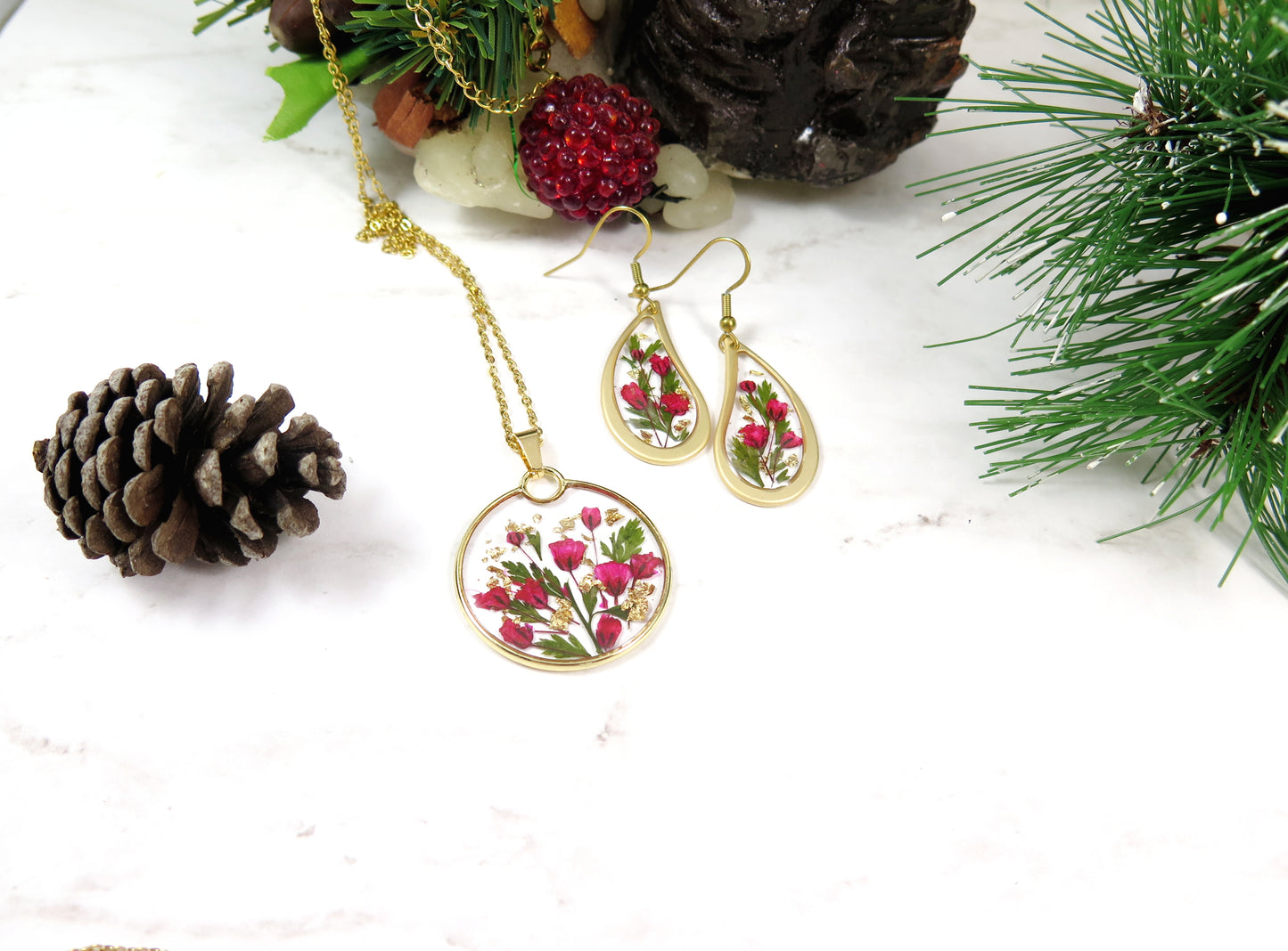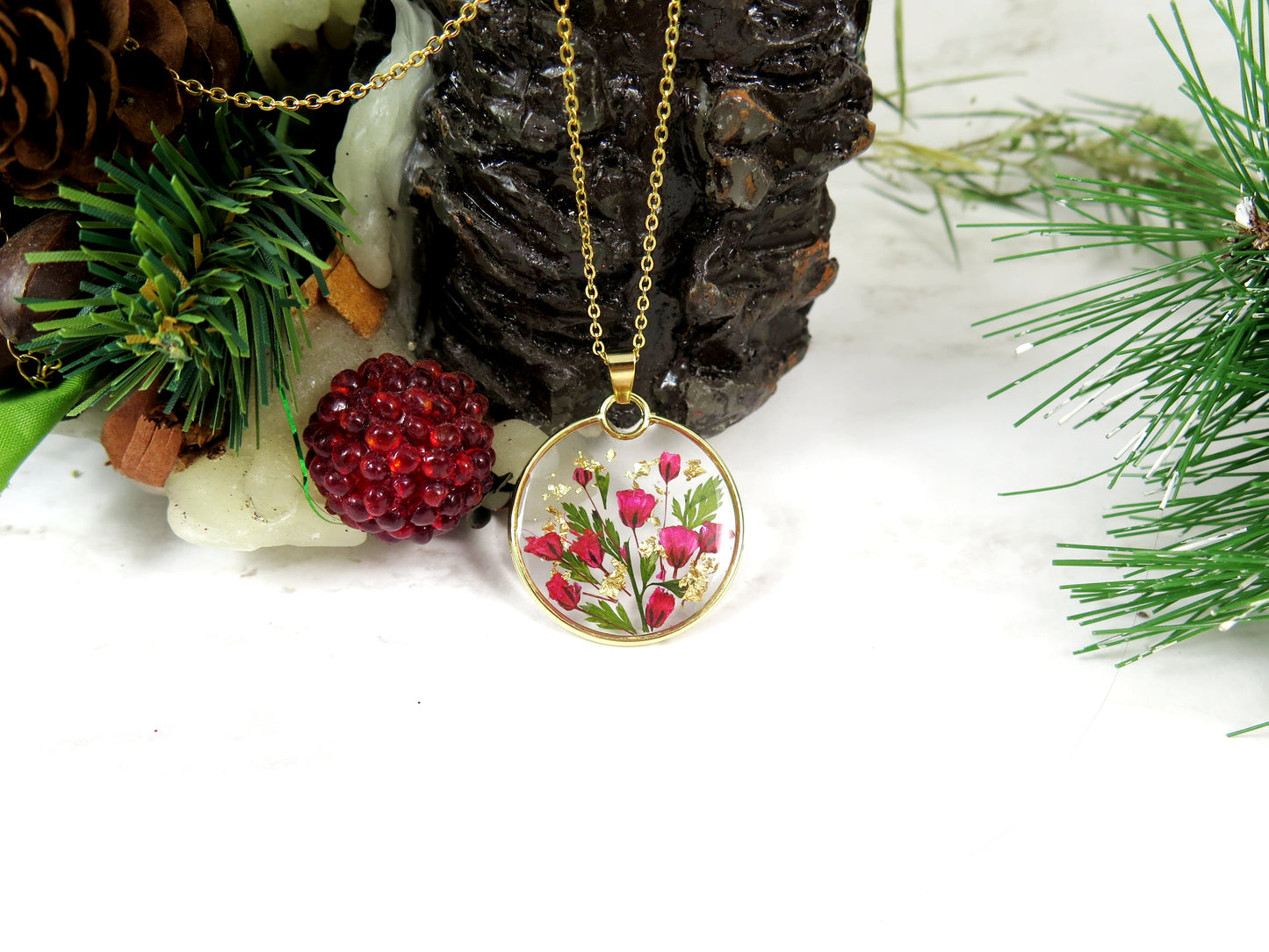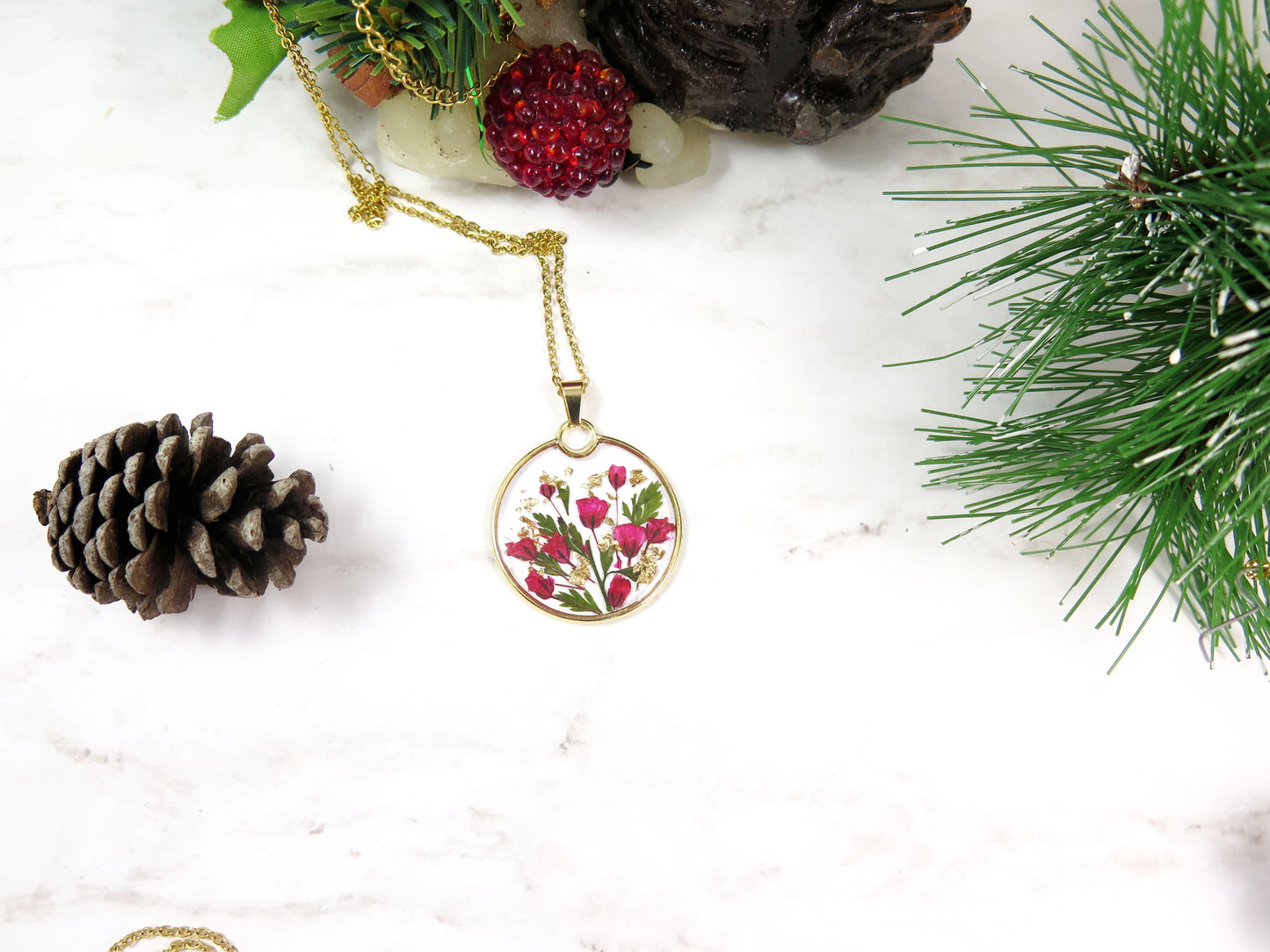 - Real pressed flowers ( baby's breath) are set in resin, surrounded by a beautiful golden circle frame. All flowers have been carefully placed in hand-poured resin, done in many steps, to give this a colorful, natural garden appearance. This Elegant Pendant will make an Eye-Catching Accessory for Any Outfit