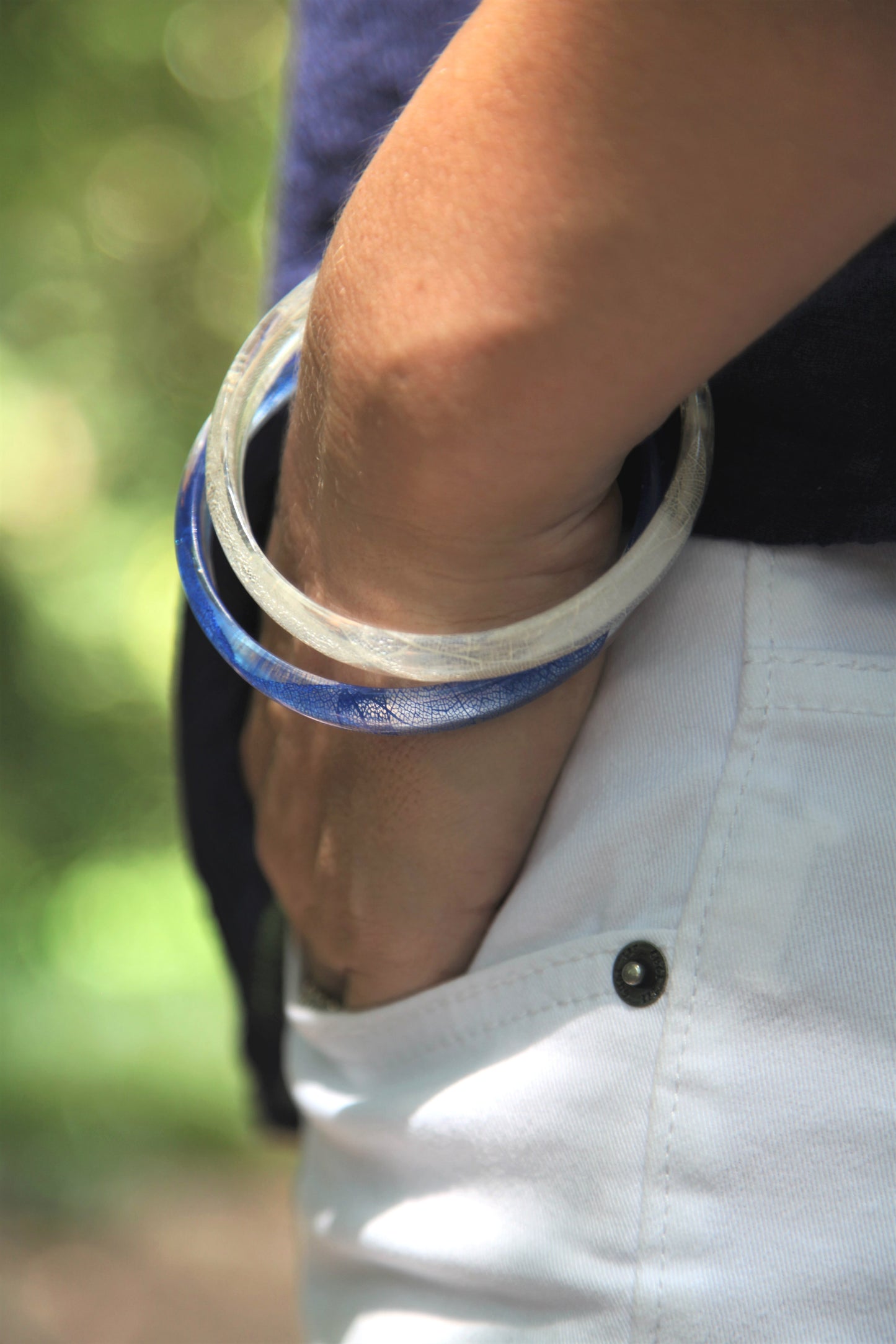 - This handmade bangle bracelet features Real fern and White Baby's breath flowers that are encased in eco resin. It is a thin bangle with a curved profile; thicker in the center and tapering on the sides. This bangle embodies contemporary resin jewelry for the nature lover.