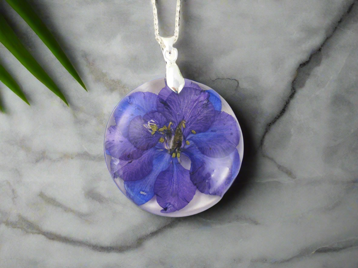 - This listing is for a resin handmade necklace with real Larkspur flower coated with a few layers of transparent resin. All have been carefully placed in hand-poured resin, done in many steps, to give this a colorful, natural garden appearance. The resin not only protects the delicate flowers, but it also magnifies their beauty as well. Giving so much love when creating this pendant makes it so desirable.