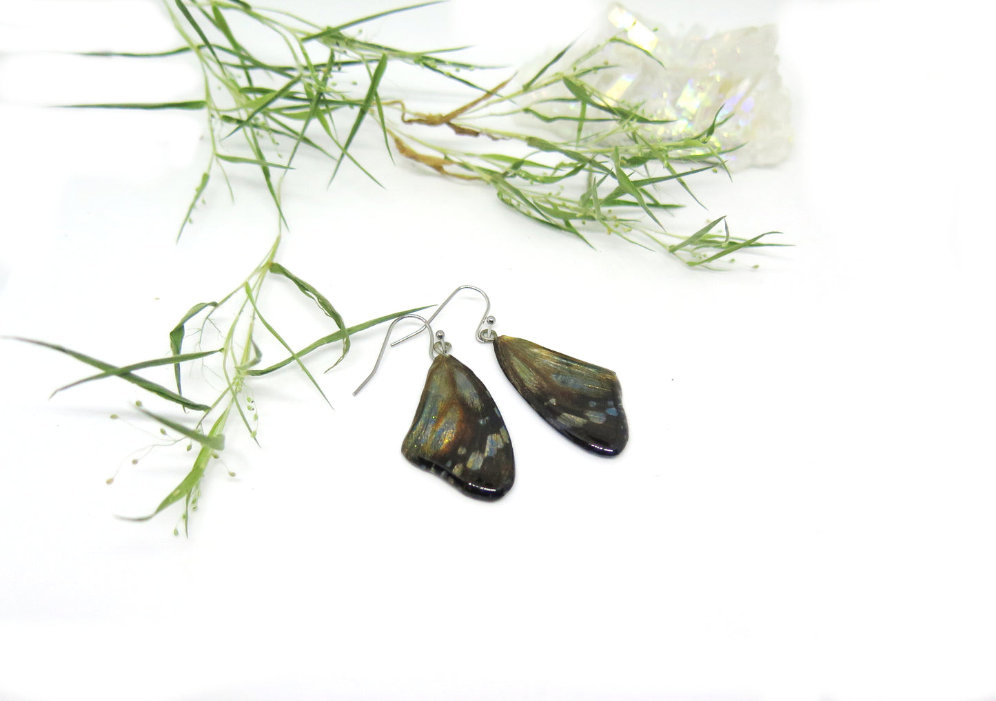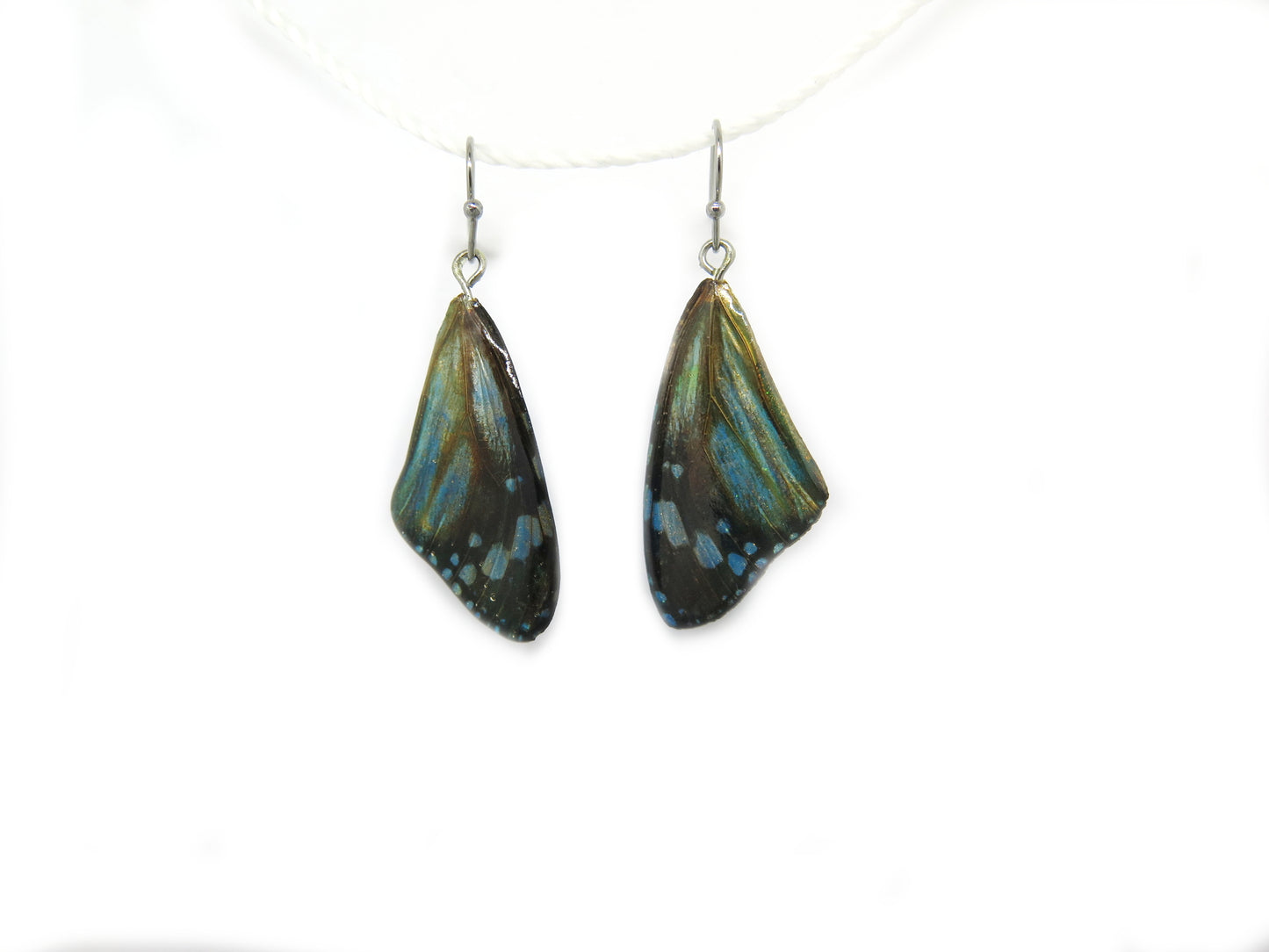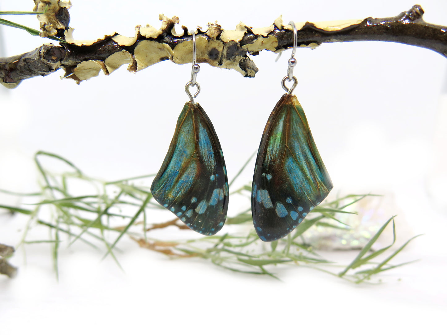 - Real butterfly wings coated with a few layers of transparent resin. Earring made of clear resin, that helps to preserve the natural beauty for a long time. Adorable real butterfly wings resin earrings are lightweight and comfortable to wear. Butterfly wings are especially beautiful in the daylight, shining of its pure color in the sun. But if you wear them in the evening, they will be light translucent, saving its unique magic.