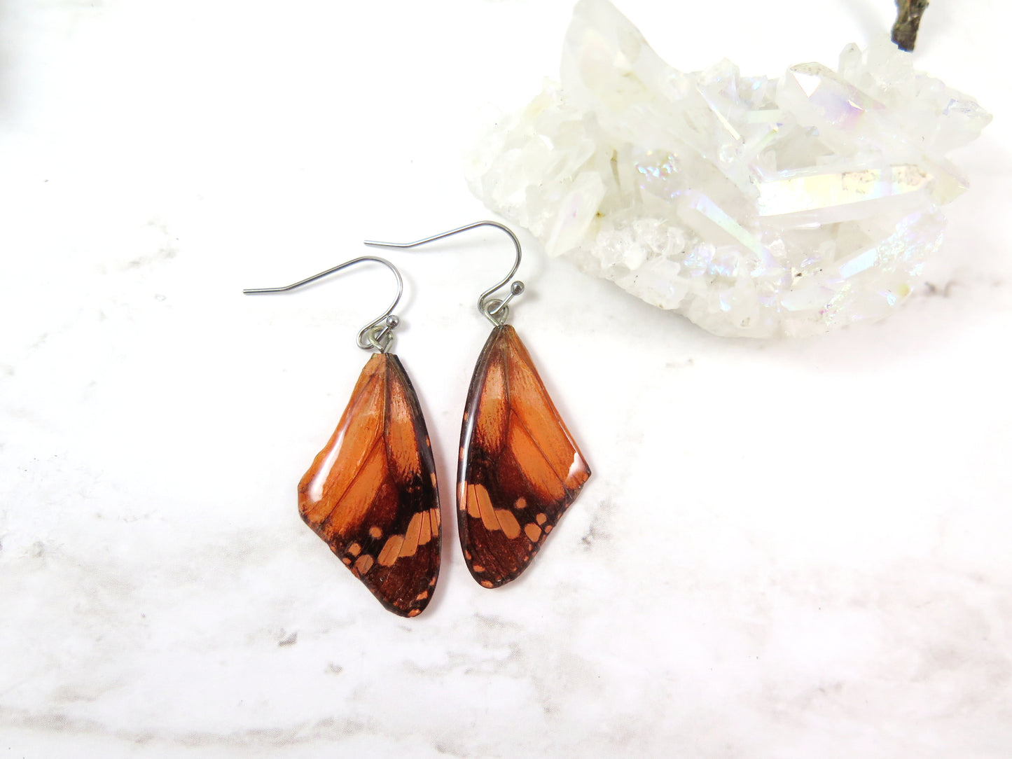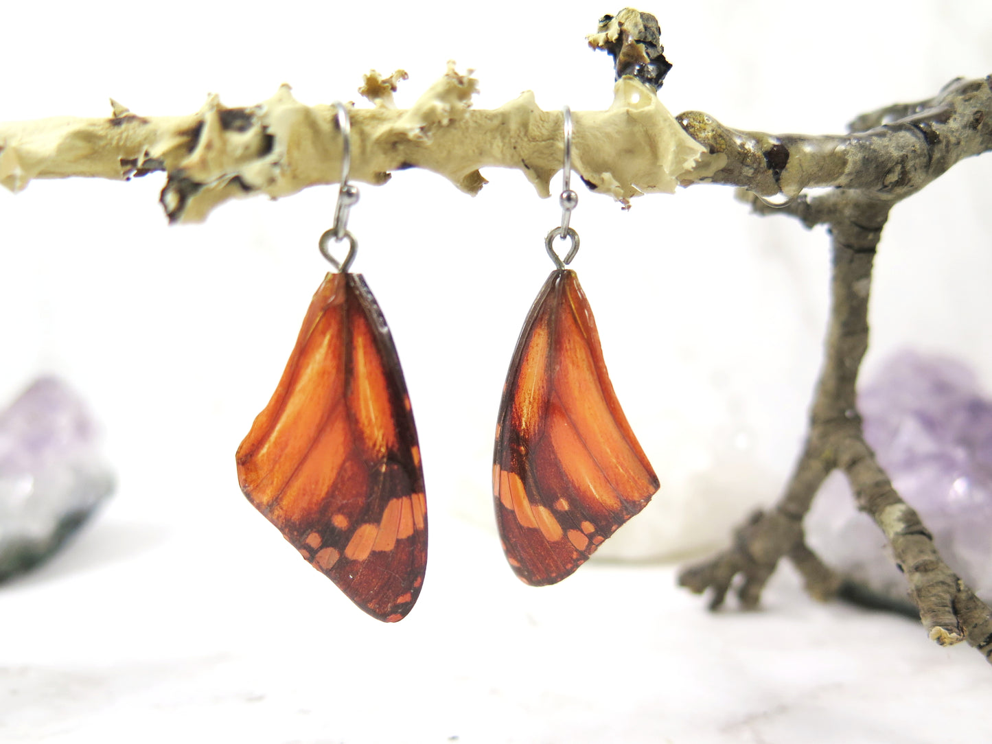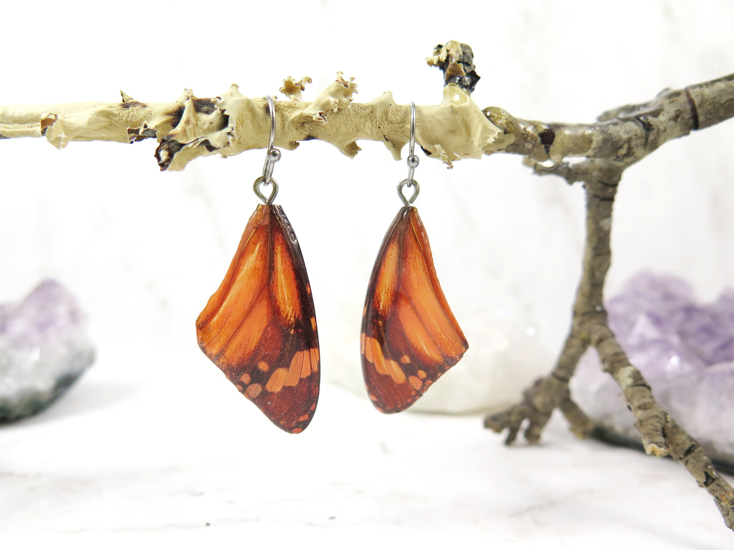 - Real butterfly wings coated with a few layers of transparent resin. Earring made of clear resin, that helps to preserve the natural beauty for a long time. Adorable real butterfly wings resin earrings are lightweight and comfortable to wear. Butterfly wings are especially beautiful in the daylight, shining of its pure color in the sun. But if you wear them in the evening, they will be light translucent, saving its unique magic.