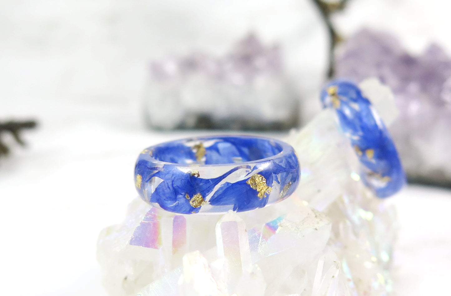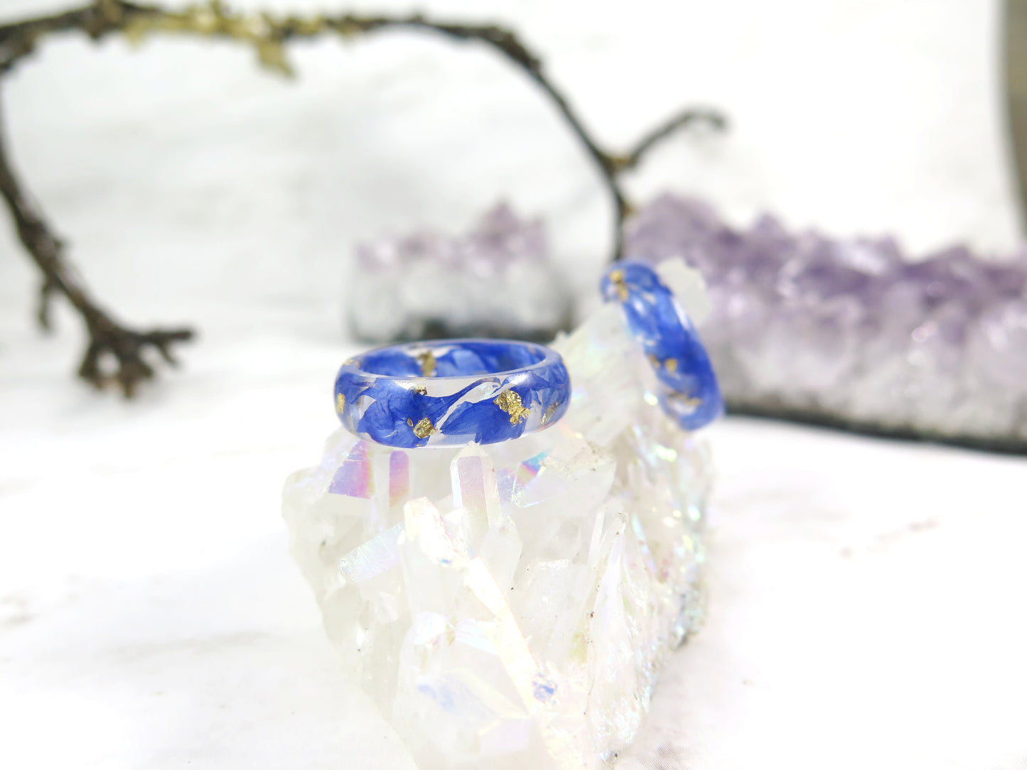 This ring features blue Cornflower petals and gold flakes, Made with high-grade eco-friendly jewelers resin