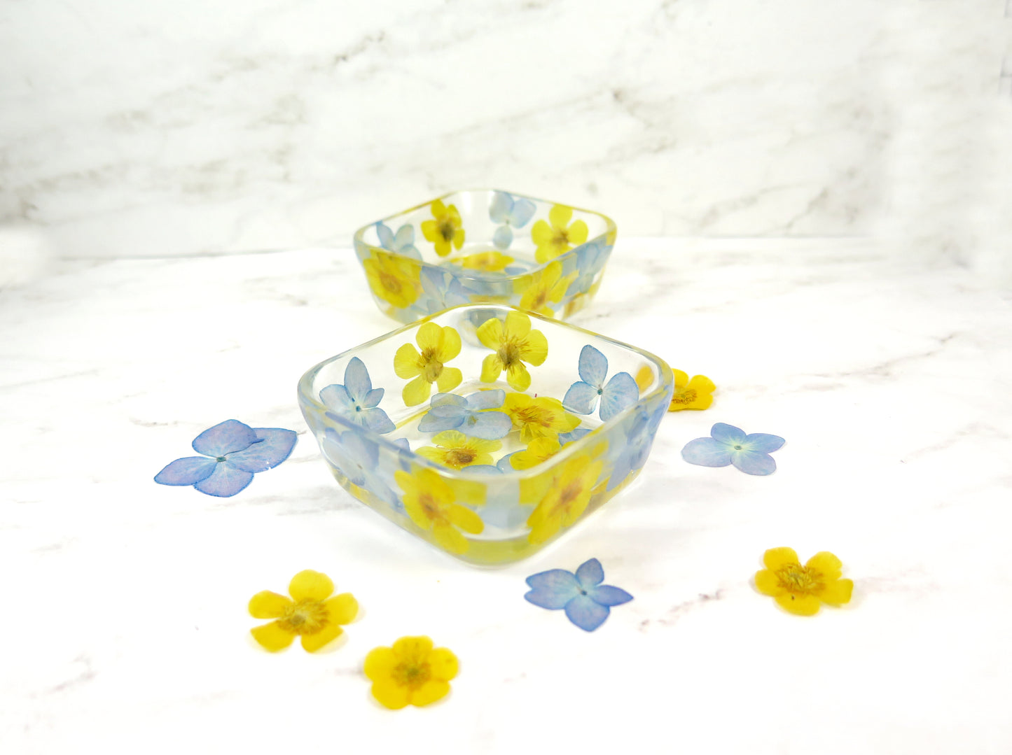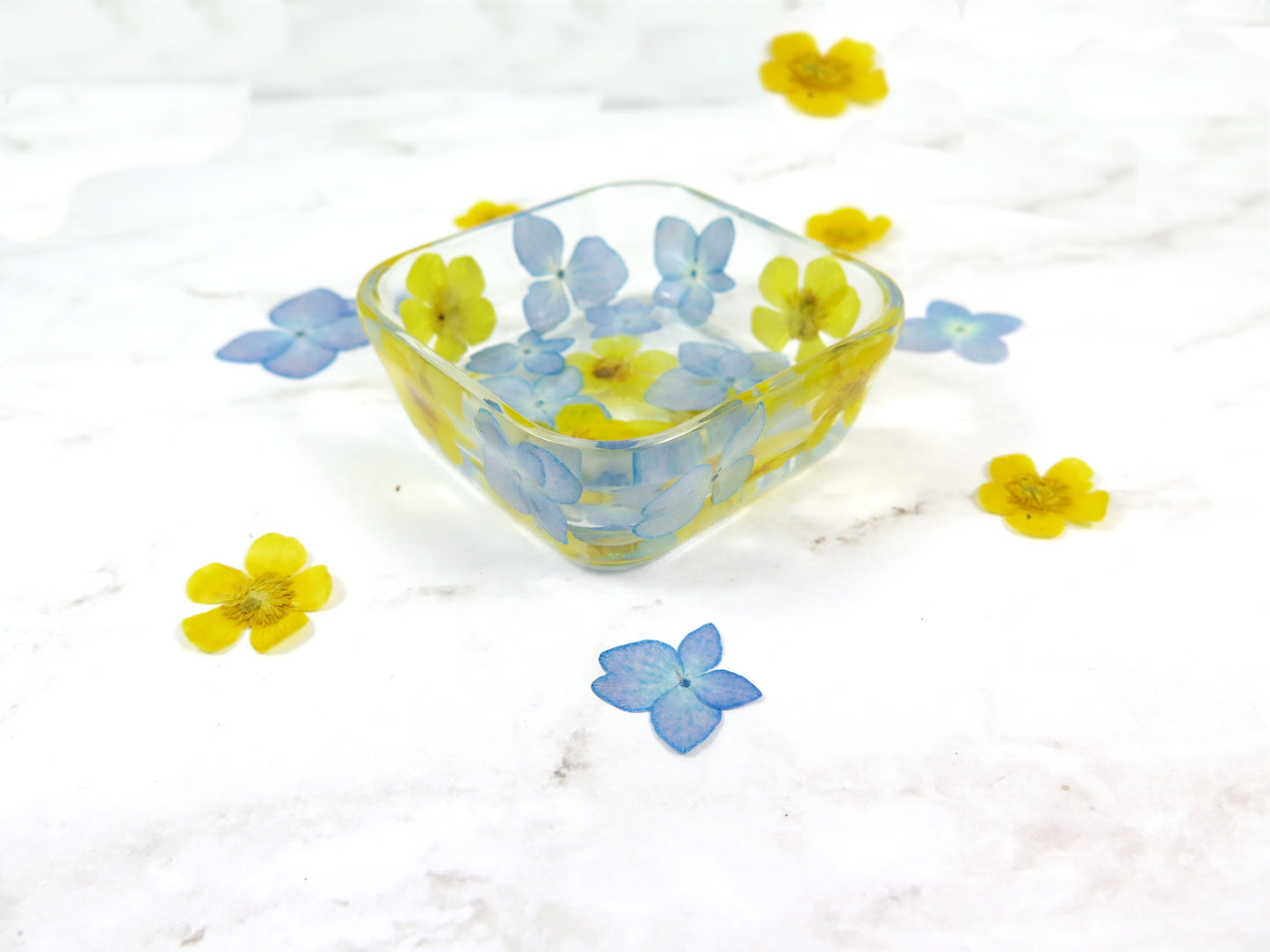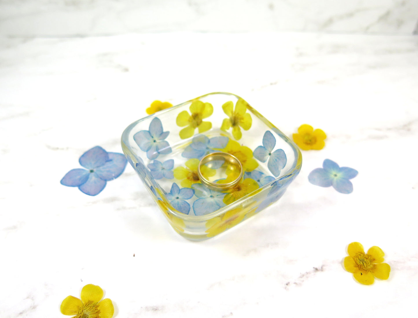 - This little floral dish is made with real flowers (Hydrangea and Buttercup) embedded into crystal clear resin. Handpicked, Dried, and Embedded into crystal clear resin this beautiful dish is perfect for any nature lover. It is made of high-quality clear resin and soft-touch finishes. Carefully sanded and polished by hand.