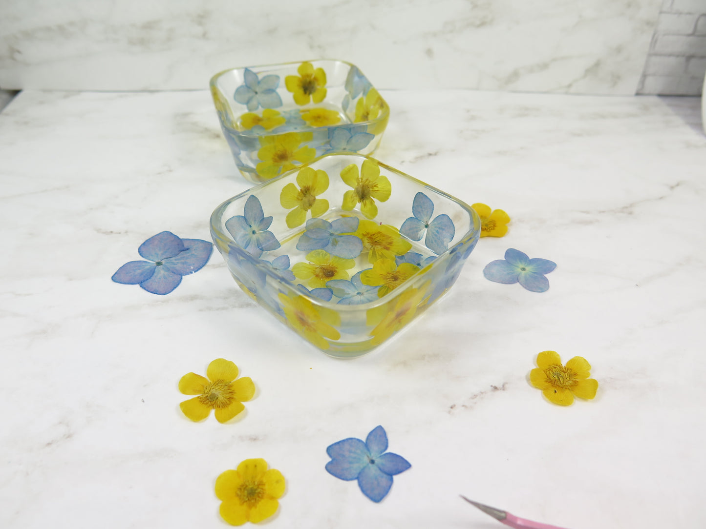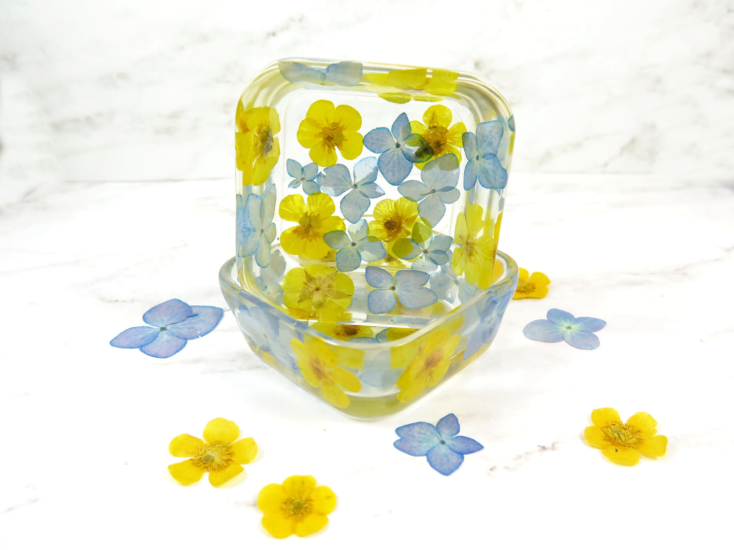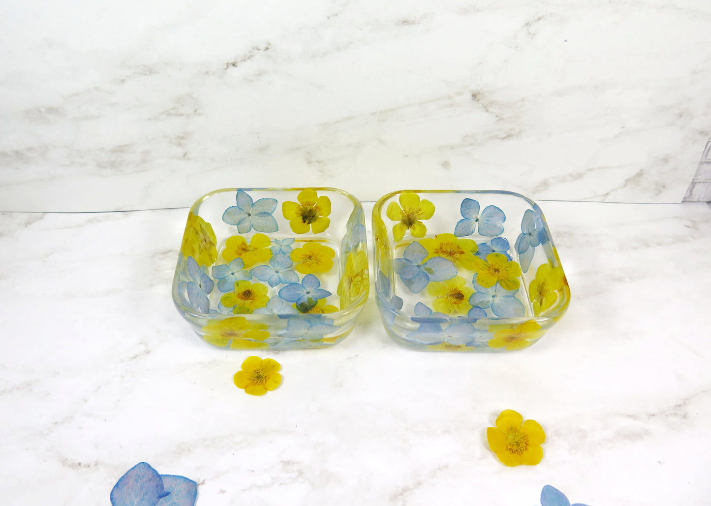 - This little floral dish is made with real flowers (Hydrangea and Buttercup) embedded into crystal clear resin. Handpicked, Dried, and Embedded into crystal clear resin this beautiful dish is perfect for any nature lover. It is made of high-quality clear resin and soft-touch finishes. Carefully sanded and polished by hand.