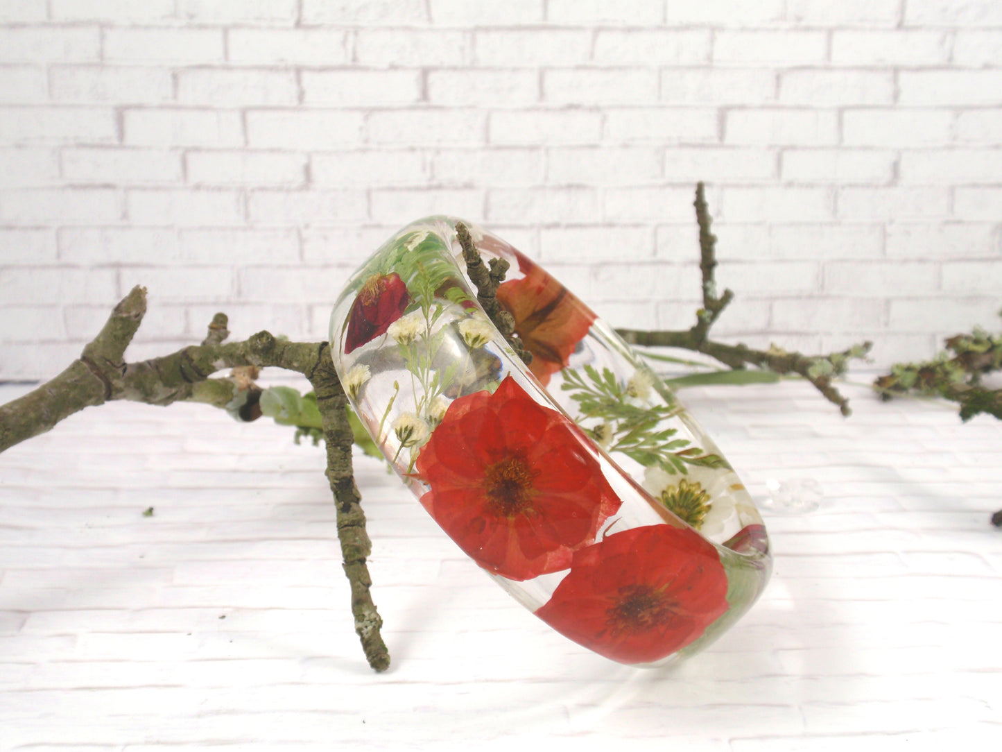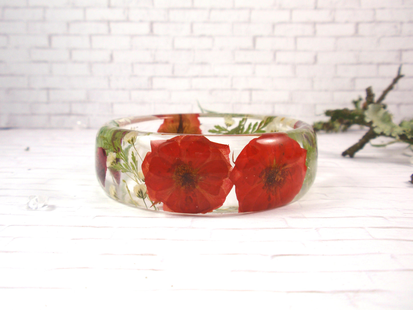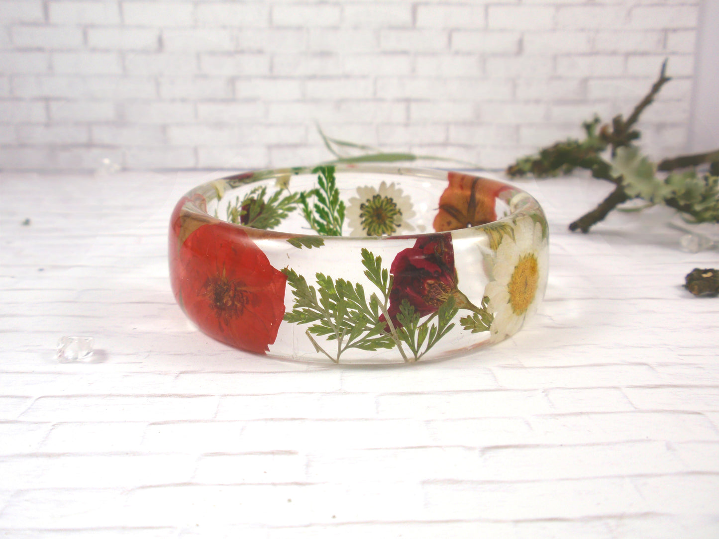 - This is a stunning bangle, filled with beautiful real flowers - daisies and red roses surrounded by rich green fern leaves and gorgeous white baby's breath flowers. It is a chunky bangle with a curved profile; thicker in the center and tapering on the sides. This bangle embodies contemporary resin jewelry for nature lovers.